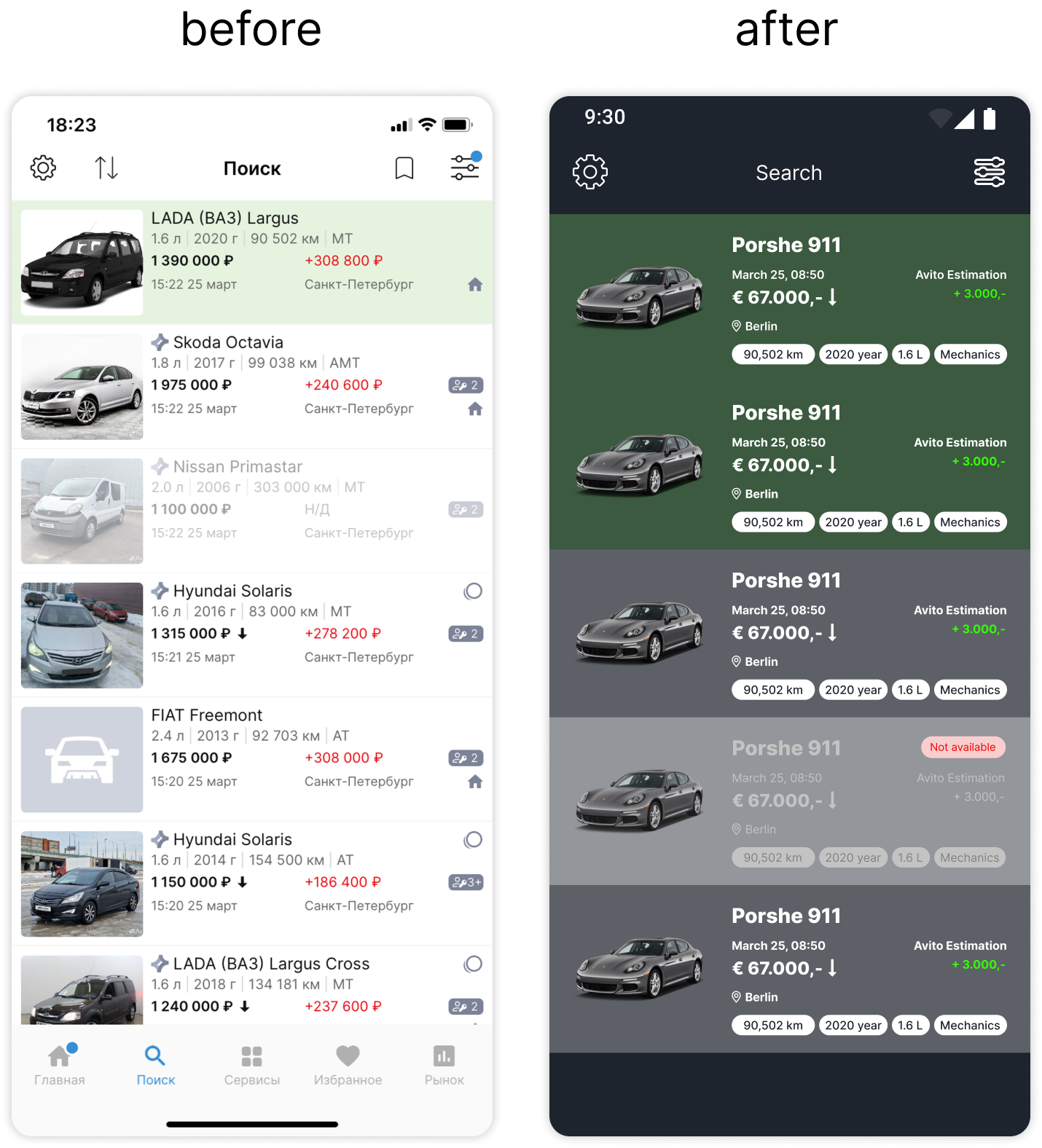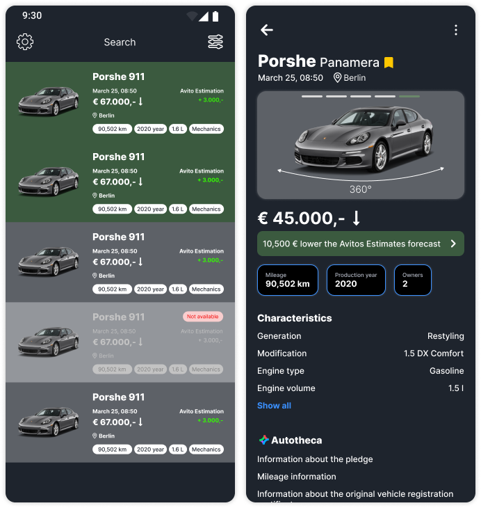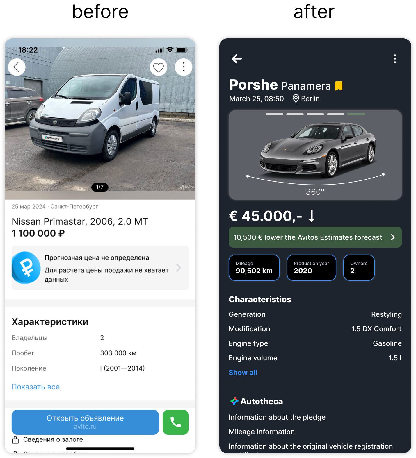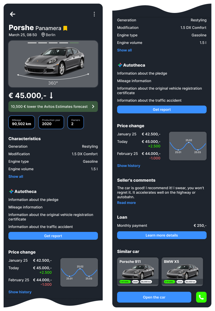 All blocks from the current card have been saved (Characteristics, Car Library, Seller's Comments, Similar Ads) + the Credit block has been added, since it is clear from stories/competitor analysis that this is an important functionality.