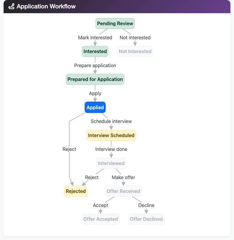 Intuitive Kanban-style tracker with manual status updates, timeline view, and quick-action shortcuts for efficient pipeline management.